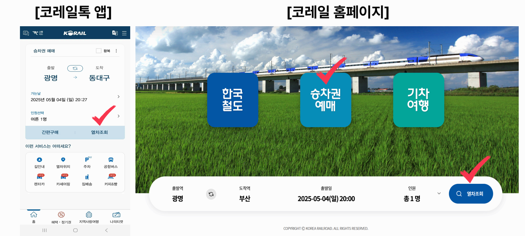 - ‘열차 조회’ → 출발역에 ‘광명’, 도착역 입력 후 조회